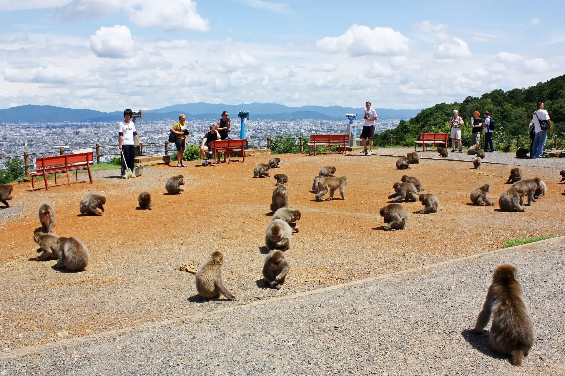 Parques y naturalezaMacacos japoneses en libertad con vistas panorámicas sobre la ciudad