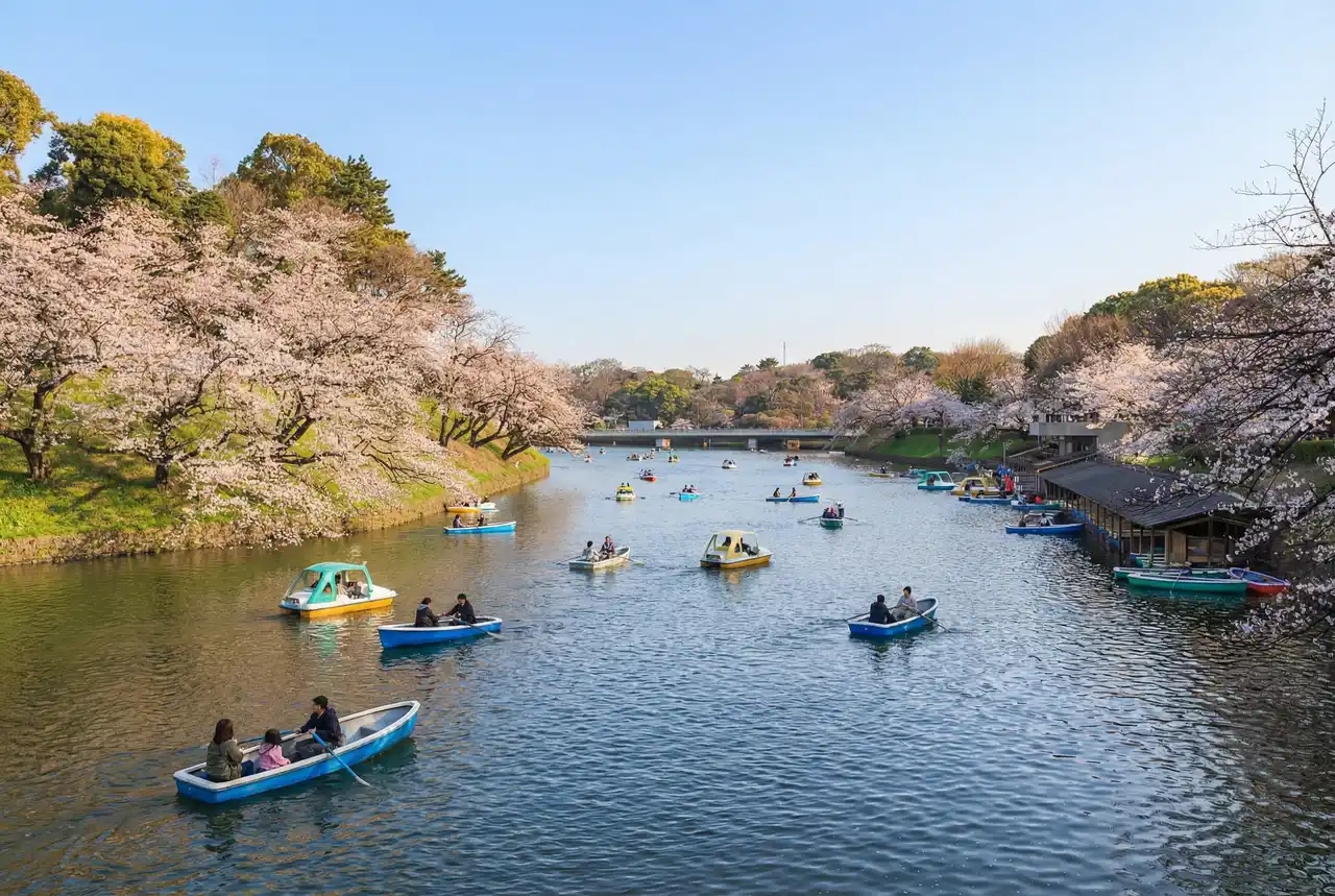 Parques y naturalezaUno de los tramos más fotogénicos para ver cerezos en flor en Tokio, con túnel floral y alquiler de barcas.