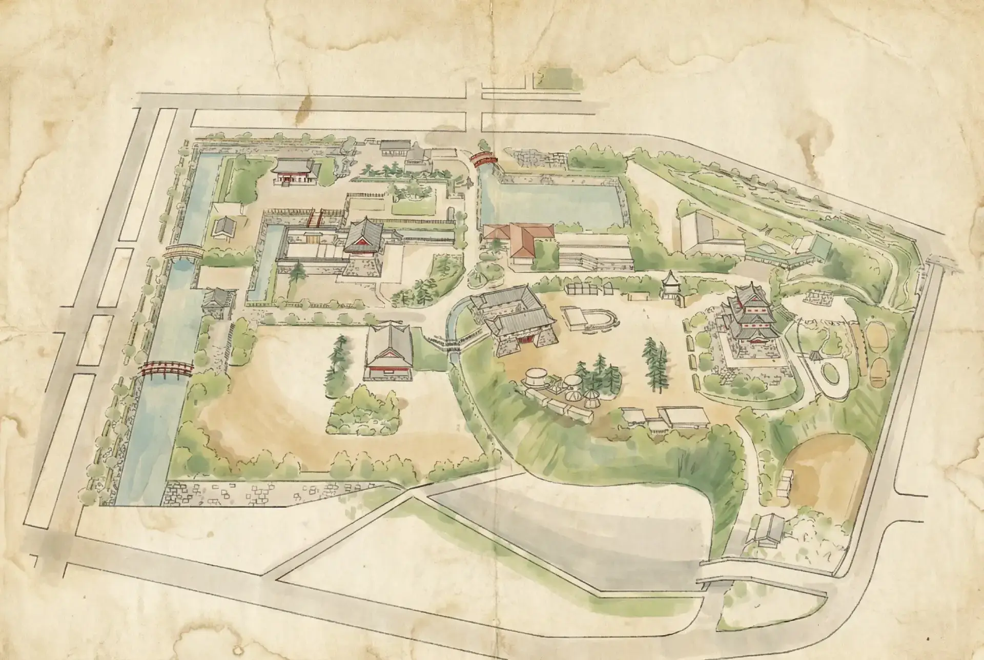 - Tokiwagi Gate y Akagane Gate, accesos reconstruidos que evocan la arquitectura defensiva del Japón feudal.