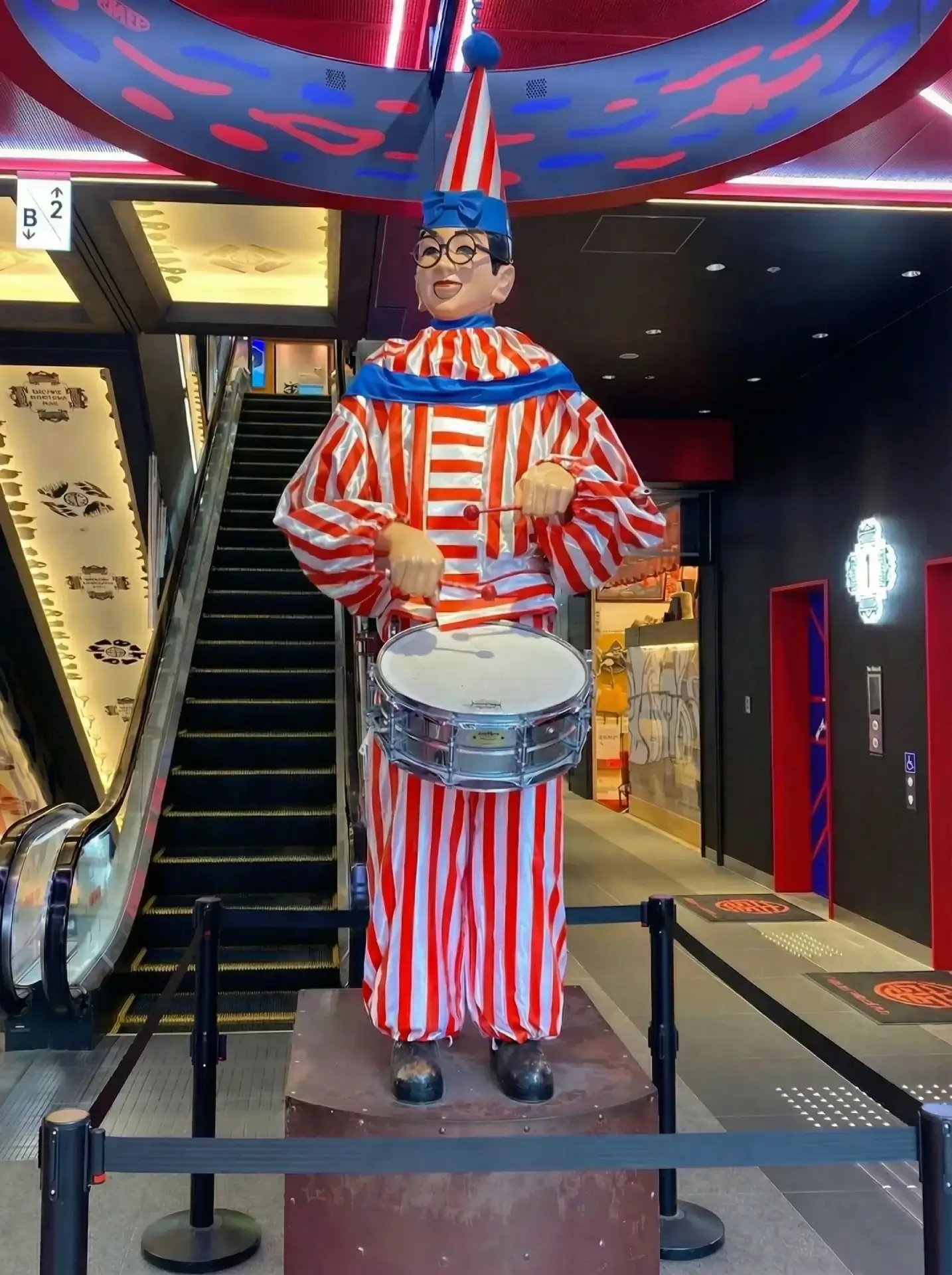 Y frente al restaurante Kuidore Taro, el simpático muñeco vestido de artista callejero da la bienvenida a los visitantes desde 1950, encarnando el espíritu hedonista de Osaka: disfrutar sin límites.